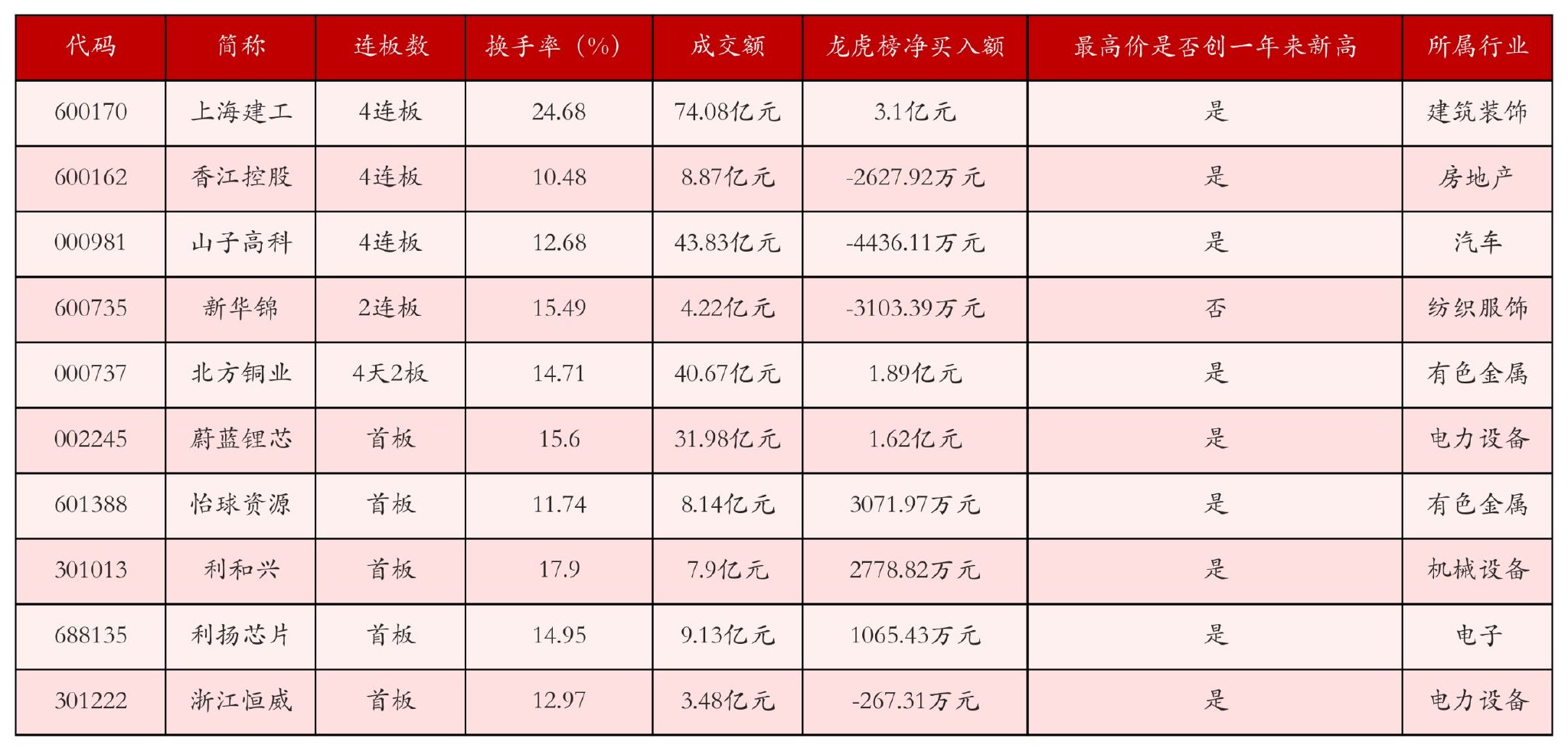 截至9月17日收盘,上证综指上涨0.37%,收于3876.34点,深证成指上涨1.16%,收于13215.46点,创业板指上涨1.95%,收于3147.35点。今日沪深两市A股共计78只涨停,综合当前连板数以及当日龙虎榜数据,其中较为强势的前三只个股分别为:上海建工(600170)、香江控股(600162)与山子高科(000981)。今日强势个股前10位具体数据见下表: